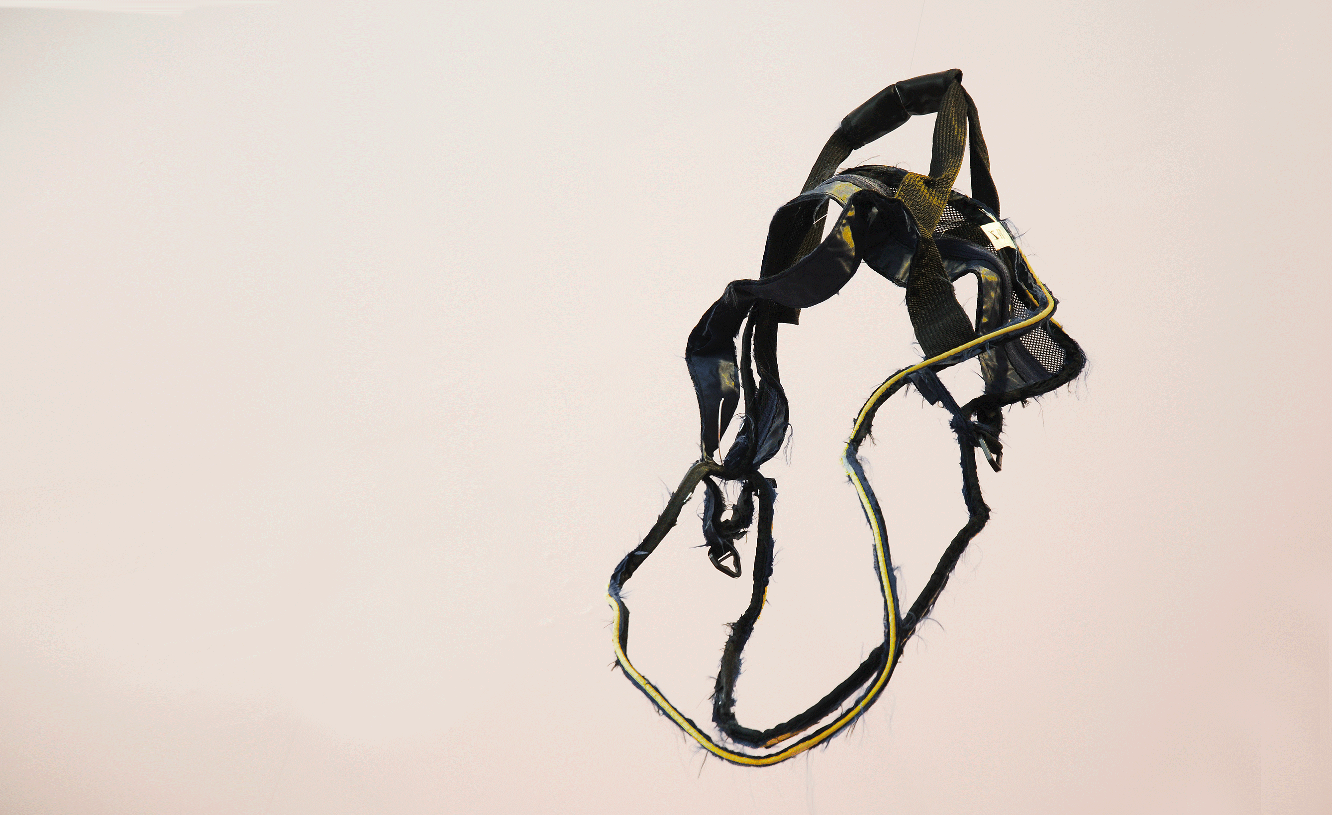Una llar ambulant. Quan la vida hi cap en dos maletes. A la instal·lació són maletes i bosses de viatge foradades, suspeses del sostre.