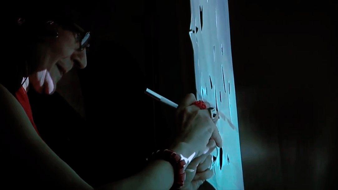 La obra se completa con una performance durante la cual los participantes agujerean la pantalla permitiendo que aparezcan imágenes de una película dentro de otra película. Así, desde la calle se ven fragmentos de poema dentro de espacios y fragmentos de espacios dentro de poemas. Para la performance se contó con la colaboración musical de Sara Pérez Fontan.